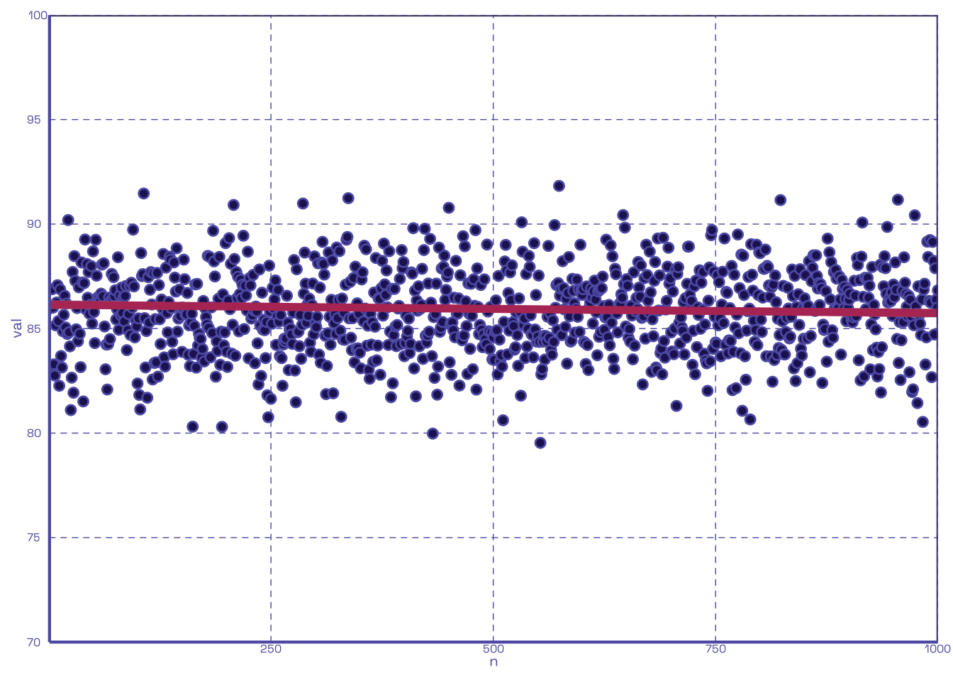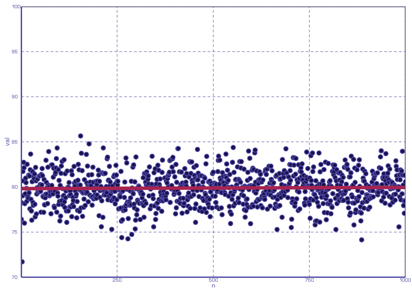 Let’s extend our prior scenario in Section 2.1 to cover a range of possible values for dropCount. Using the same number of quizzes distributed per student (20), the same mean (80), and the same number of loops (1000), but iterating dropCount from 1 through