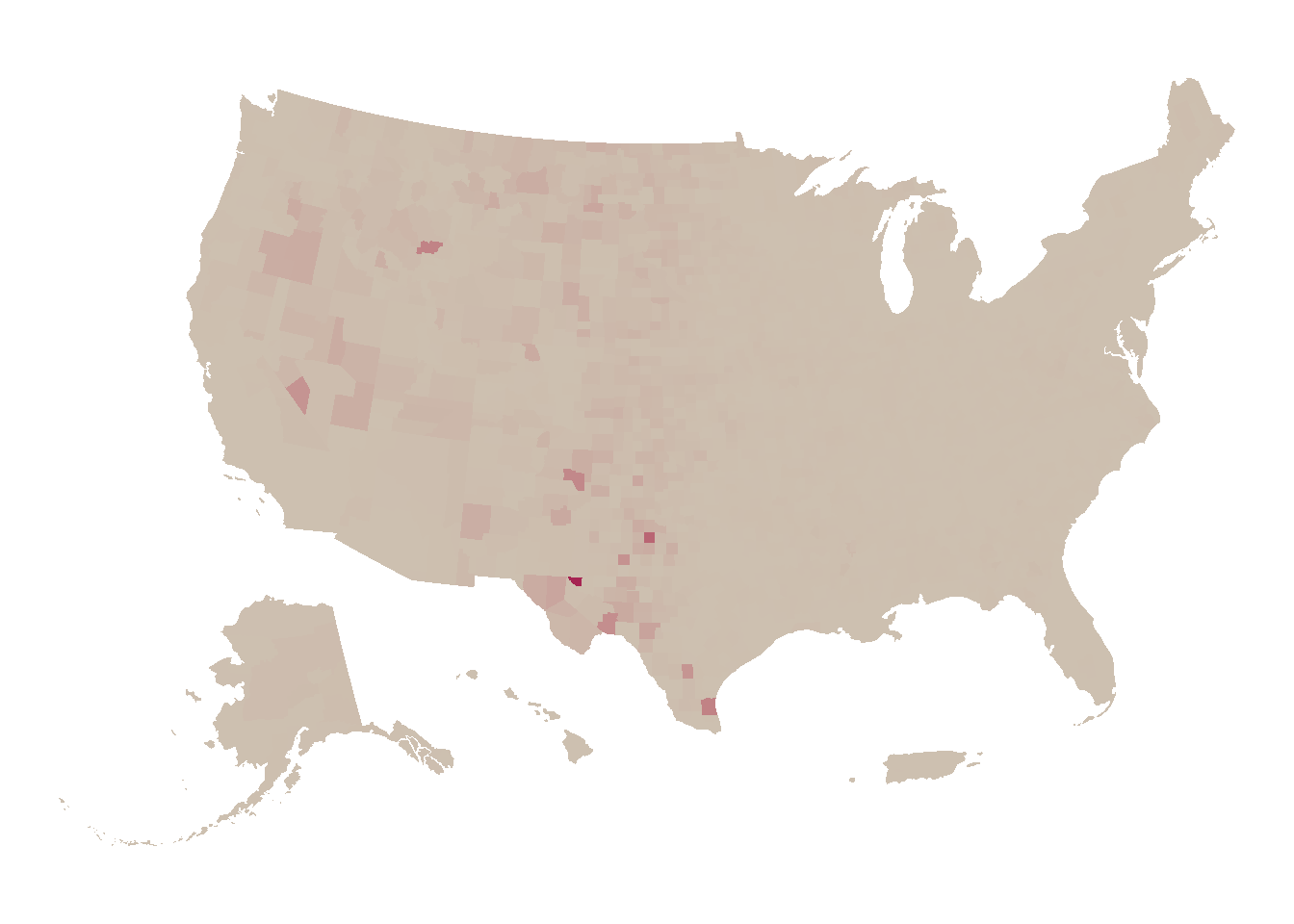 Presumably, we may expect that the proportion of roads to county area is higher among smaller counties, and we know that county sizes tend to be larger towards the Western half of this country (the United States), so we should see higher proportions in the East. Conversely, we know that the population of this country is largely concentrated in the East, so we may anticipate a higher proportion in the West, given that some areas there are extremely sparsely populated. Let’s see what we get.